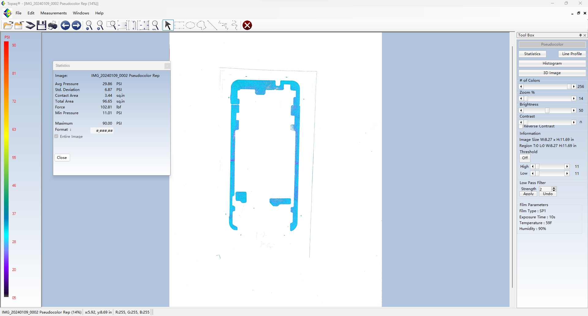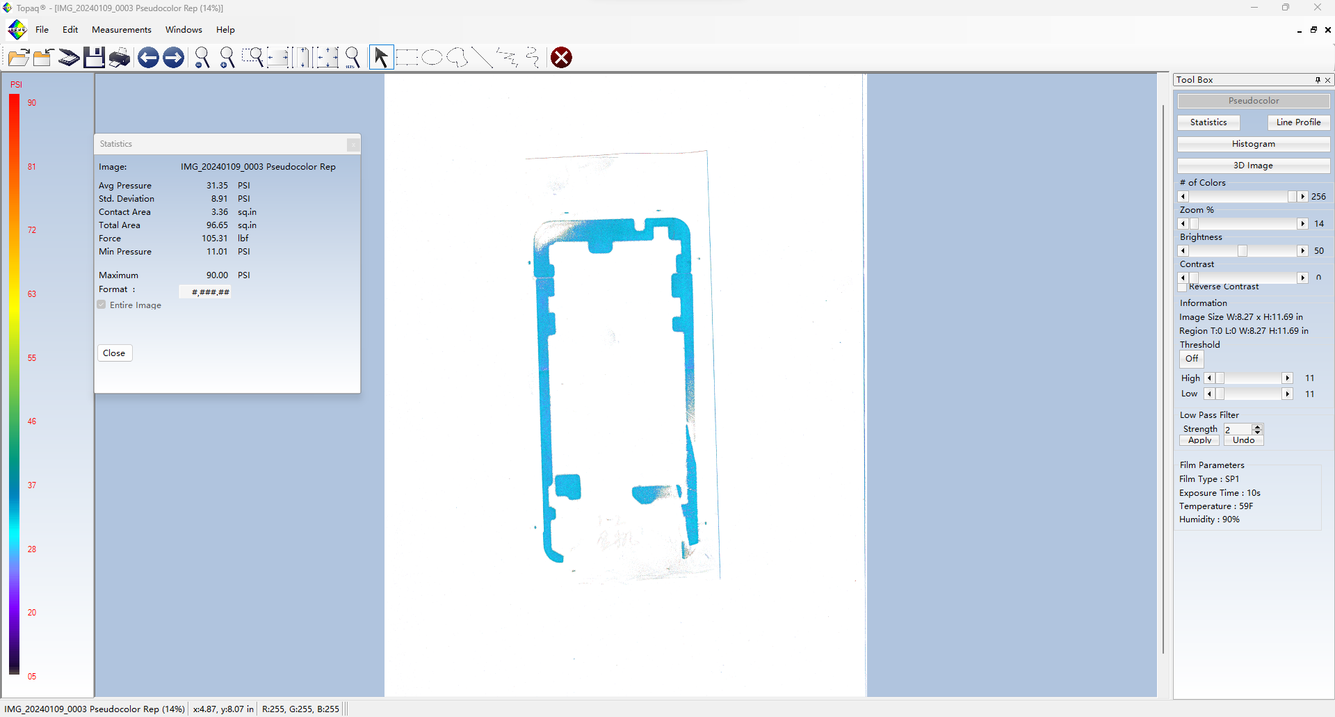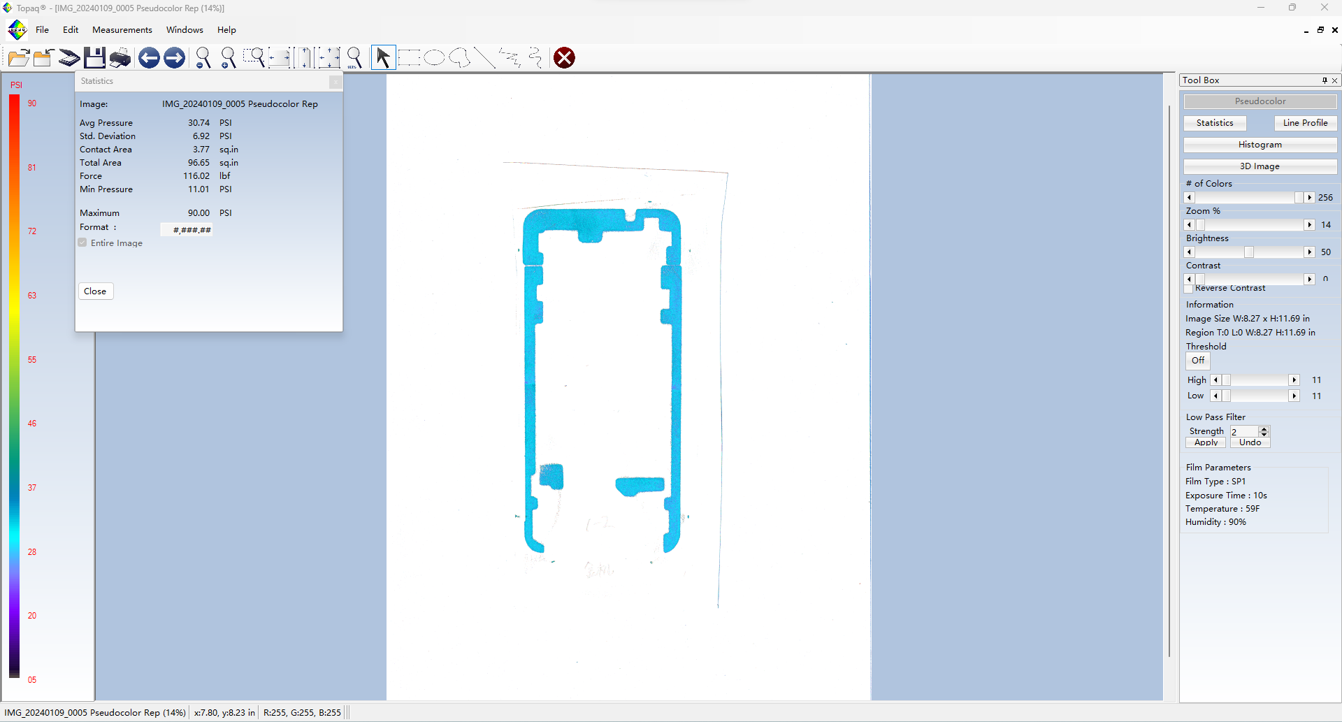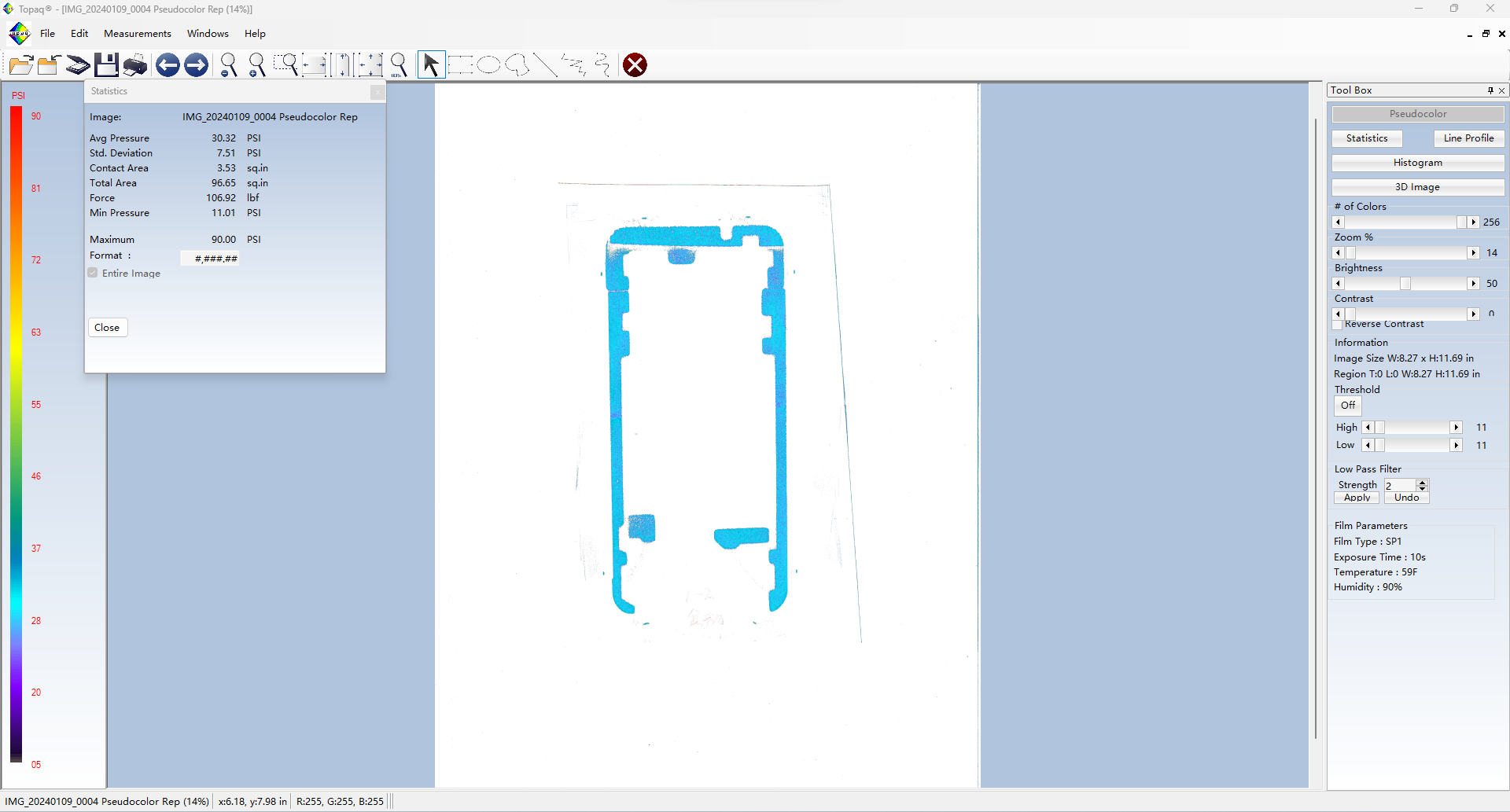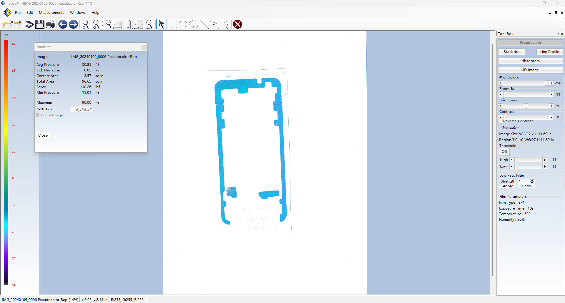 Topaq 感壓紙數(shù)據(jù)分析系統(tǒng):由經(jīng)過特殊校準的密度掃描儀和Windows軟件組成。通過掃描壓敏紙上的圖像可以在軟件里量化成具體的數(shù)據(jù)值,可以將壓敏紙呈現(xiàn)的圖像轉換成3維圖像。并可以根據(jù)色階區(qū)分力值大小。
